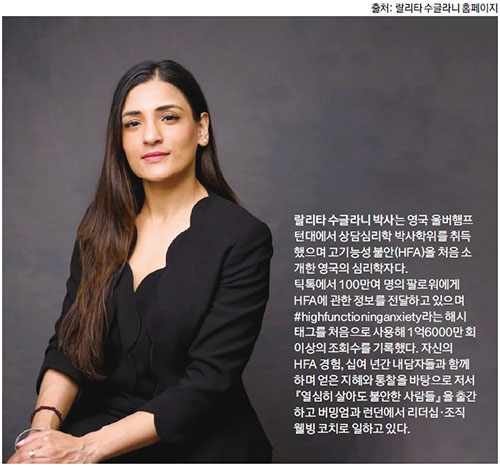 영국의 심리학자이자 리더십 및 조직 웰빙 코치인 랄리타 수글라니 박사는 겉으로 바람직해 보이는 소위 ‘건강한 불안’을 ‘고기능성 불안(High-Functioning Anxiety, HFA)’이라 부른다. 불안이 늘 공황장애나 신경 쇠약 등의 형태로 나타나는 것이 아니라 때로는 기능적 탁월함으로 발현된다는 것이다. 실제로 불안한 사람들은 내면의 시끄러운 목소리와 싸우면서도 높은 업무 성과, 훌륭한 성적을 내며 자신의 가치를 증명하기 위해 쉼 없이 몰아붙인다. 그러나 이들은 성취를 이루고도 늘 부족하다고 느끼면서 또다시 과도한 생각의 틀에 자신을 옭아맨다.