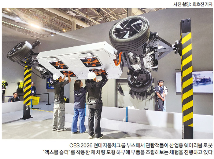 특히 제조 현장을 재현한 ‘Collaborative Assembly(로봇과 함께하는 조립)’ 존에서는 AI 로보틱스가 어떻게 공장의 효율성을 높일 수 있는지를 시연하며 사람과 로봇이 역할을 분담하는 새로운 작업 표준을 제시했다. 관람객들은 산업용 웨어러블 로봇 ‘엑스블 숄더(X-ble Shoulder)’를 착용한 채 전시된 차량 모형 하부에 직접 부품을 조립해보는 체험을 진행했다. 어깨에 착용하는 엑스블 숄더는 팔 상완부를 보조해 제조 현장에서 반복적인 위 보기 작업을 수행할 때 어깨 관절 부담을 최대 60%까지 줄여준다. 현장에서 만난 현대차그룹 관계자는 “엑스블 숄더는 현재 양산 단계로 현대·기아차 공장에서 차량 하부 조립 시는 물론 항공·농업 등 다양한 산업 현장에 B2B로 판매하고 있다”고 말했다.