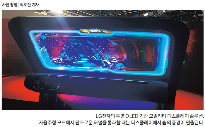자율주행 모드에서는 디스플레이의 역할이 한층 확장됐다. 운전할 필요가 없는 자율주행 모드에서 윈드실드 위에는 3D 가상 공간이 구현되며 몰입형 경험을 제공했다. 단조로운 터널을 통과할 때 디스플레이에 숲의 풍경이 연출되거나 가로수가 늘어선 길에서는 벚꽃잎이 디스플레이 위로 흩날리는 식이다. 조수석에 앉는 동승자를 위한 경험 설계도 눈길을 끌었다. 운전하지 않는 동승자는 조수석 앞 디스플레이를 통해 상품 정보를 불러오고 즉시 구매로 연결할 수 있다. 이처럼 미래 모빌리티 비전을 생생하게 구현한 LG전자의 투명 OLED 기반 모빌리티 디스플레이 솔루션은 CES 2026 차량용 엔터테인먼트 부문에서 최고혁신상을 수상했다.