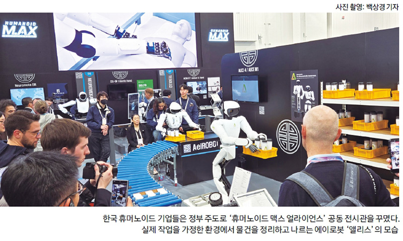 중국 공세에 맞선 한국 휴머노이드 기업들은 실용성에 초점을 맞췄다. 이들은 산업통상자원부 주도로 ‘휴머노이드 맥스 얼라이언스(HUMANOID M.AX Alliance)’라는 이름으로 제조업 혁신을 테마로 한 공동 전시관을 꾸몄다. 그중에서도 시선을 잡아 끈 건 에이로봇(AeiROBOT)의 휴머노이드 앨리스였다. 이족 보행 로봇인 앨리스4와 다리가 바퀴로 된 휠 타입 앨리스 M1은 제품 포장을 가정한 환경에서 쉴 새 없이 물건을 정리하고 날랐다. 에이로봇의 최고기술책임자인 한재권 한양대 교수는 “로봇은 화려한 퍼포먼스를 보여주기 위해 존재하는 게 아니다”라며 “인간의 일을 얼마나 대신할 수 있을지에 초점을 두고 실제 효용을 보여주는 데 집중했다”고 말했다.