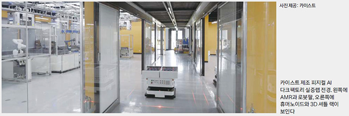 대전 카이스트(KAIST) 산업경영학동 1층의 한 연구실. 출입문을 열고 들어서자 390㎡(약 118평) 규모의 공간이 한눈에 펼쳐졌다. 일반적인 대학 연구실의 풍경과는 전혀 달랐다. 천장에는 OHT(공중물류반송시스템) 레일이 타원형 궤도를 그리며 깔려 있고, 바닥에선 ‘KAIST 01’ ‘KAIST 04’ 등 번호가 매겨진 AMR(자율주행이동로봇)이 소리 없이 이동하고 있었다. 유리 부스 안에서는 흰색 로봇팔 두 대가 쉼 없이 부품을 집어 올리고 내려놓기를 반복했다. 그 너머 다층 랙 사이를 수평과 수직으로 오가는 3D 셔틀, 선반 앞에 서 있는 휴머노이드까지.