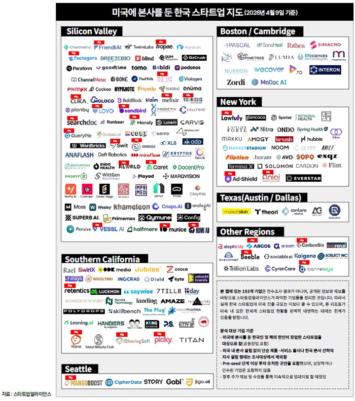 최근 몇 년 사이 한국 스타트업의 해외 진출 방식이 변화하고 있다. 스타트업의 최대 진출국인 미국 시장만 봐도 과거에는 일부 기술 기반 기업 중심이었다면 이제는 특정 산업에 국한되지 않고 다양한 분야의 스타트업이 미국 시장에 직접 도전하는 흐름이 확산되고 있다. 이는 미국 진출이 점차 보편적인 성장 전략으로 자리 잡고 있음을 보여준다. 다만 사례는 늘고 있음에도 개별 기업의 성공 스토리를 넘어 이러한 변화가 어떤 구조적 흐름 속에서 나타나는지를 보여주는 데이터는 충분하지 않았다. 스타트업얼라이언스는 이러한 흐름을 입체적으로 분석하기 위해 올해 2월 ‘2026 미국 소재 한국계 스타트업 맵’ 리포트를 발간했다. 이 리포트는 미국에 소재한 한국인 또는 한국계 미국인이 창업(공동 창업 포함)한 스타트업 165곳을 대상으로 지역 분포와 진출 방식 등을 분석해 미국 진출 양상을 데이터로 정리했다. 또한 28개의 신규 기업을 포함해 총 193개 스타트업을 대상으로 산업 분야, 투자 단계, 설립 연도 등을 중심으로 추가 분석을 진행했다.