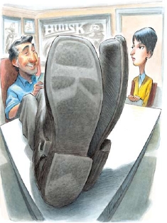 헌스크에서 첫 인사를 하던 날 엑트는 좋은 인상을 남기기 위해 신경 써서 옷을 입었다. 옷장에 걸려 있는 가장 고급스러운 정장과 크림색 와이셔츠를 챙겨 입고 부드러운 갈색과 녹색 무늬가 잘 어우러진 넥타이를 맸다. 그러나 헌스크의 홍보팀장 폴라 마케시는 엑트의 바짓단 아래로 보이는 밑창이 두툼하고 광을 내지 않은 투박한 검은색 구두가 다소 거슬렸다. 마케시는 속으로 “저런 구두를 신다니”라고 생각했다.