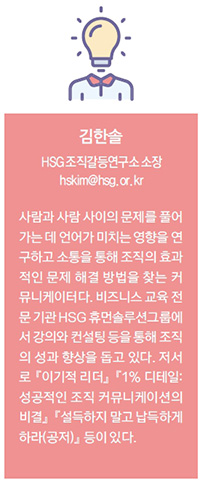 사람과 사람 사이의 문제를 풀어가는 데 언어가 미치는 영향을 연구하고 소통을 통해 조직의 효과적인 문제 해결 방법을 찾는 커뮤니케이터다. 비즈니스 교육 전문 기관 HSG 휴먼솔루션그룹에서 강의와 컨설팅 등을 통해 조직의 성과 향상을 돕고 있다. 저서로 『이기적 리더』 『1% 디테일: 성공적인 조직 커뮤니케이션의 비결』 『설득하지 말고 납득하게 하라(공저)』 등이 있다.