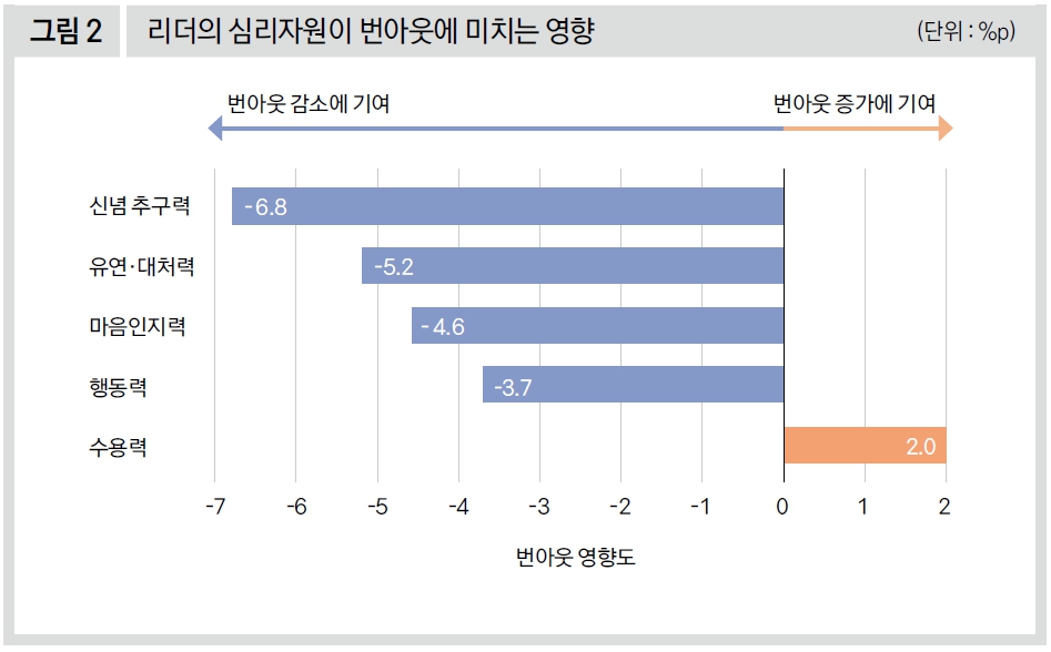 2) 착한 리더 신드롬 극복하기반대로 타인의 과오를 지나치게 수용할수록 리더의 번아웃 위험이 높았다. 특히 신임 리더들에서 많이 관찰되는 ‘착한 리더 신드롬’은 미움받기를 두려워하는 마음에서 비롯된다. 사실은 괜찮지 않은 구성원의 업무 태도나 결과물에 대해 괜찮다고 넘어가는 일이 몇 번만 반복돼도 조직의 기준은 하향 평준화되고 비슷한 과오가 반복될 수 있다. 그리고 그 기대와 현실의 격차를 메우는 것은 결국 리더의 몫이기에 수용력이 높은 리더는 빨리 지칠 수밖에 없다. 프로페셔널하고 건강한 기준을 세우고 이를 지켜 나갈 때 리더는 동력을 잃지 않는다. 타인에 대한 너그러움과 자기 보호의 균형을 맞춰야 지속가능한 리더십을 유지할 수 있다.