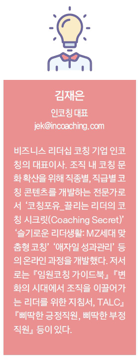 비즈니스 리더십 코칭 기업 인코칭의 대표이사. 조직 내 코칭 문화 확산을 위해 직종별, 직급별 코칭 콘텐츠를 개발하는 전문가로서 ‘코칭포유_끌리는 리더의 코칭 시크릿(Coaching Secret)’ ‘슬기로운 리더생활: MZ세대 맞춤형 코칭’ ‘애자일 성과관리’ 등의 온라인 과정을 개발했다. 저서로는 『임원코칭 가이드북』 『변화의 시대에서 조직을 이끌어가는 리더를 위한 지침서, TALC』 『삐딱한 긍정직원, 삐딱한 부정직원』 등이 있다.