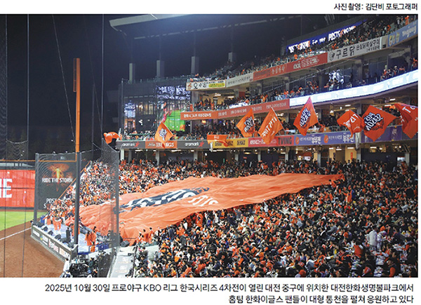 2025년 10월 30일 프로야구 KBO 리그 한국시리즈 4차전이 열린 대전 중구에 위치한 대전한화생명볼파크. 8회 말 한화이글스의 공격이 시작되자 “최!강!한!화!” 구호가 경기장을 흔들었다. 1루 응원석에서는 주황색 깃발이 물결처럼 펄럭였고 한화이글스 팬들은 타월을 들어 올리며 응원의 열기를 더했다. 홈팀 한화이글스의 분위기가 한창 고조되던 중 분위기가 반전됐다. 9회 초 LG트윈스가 역전에 성공한 것이다. 3루 응원석에서 함성이 쏟아지며 LG트윈스 로고가 크게 박힌 유광 점퍼 차림의 팬들은 힘차게 응원가를 따라불렀다.