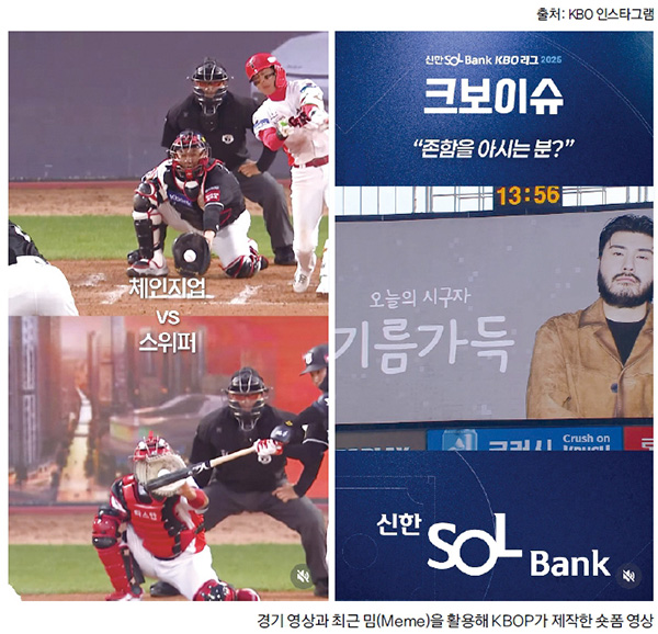 2. “고화질로, 빠르게, 최대한 많이”KBO 콘텐츠를 제작하는 디지털 마케팅팀의 운영 방식은 ‘콘텐츠 공장’에 가깝다. 핵심은 ‘속도와 빈도’다. 매일 콘텐츠 물량 공세를 이어가는 것이 핵심 전략이다. KBOP 디지털 마케팅팀은 정규 시즌 중 하루 8~13개 영상을 쏟아낸다. 경기 중 발생하는 주요 장면을 실시간으로 편집해 섬네일과 제목만 달아 즉시 업로드한다. ‘정제된 퀄리티보다 확산되는 타이밍이 더 중요하다’는 판단에서다. 인스타그램 그리드(Grid)를 맞춰 예쁘게 올리는 디자인적 규칙이나 업로드 순서를 정하지 않고 터질 것 같은 영상은 편집해 즉시 올린다.이런 물량 공세의 목적은 소셜미디어의 알고리즘을 타기 위함이다. 실제로 KBO 인스타그램 조회수의 60~70%는 채널 비구독자에게서 발생하고 있는데 이는 끊임없이 영상을 공급해 알고리즘 파도에 태운 결과다. 조회수의 상당 비율이 비구독자층에서 나온다는 점을 고려해 디지털 마케팅팀은 야구 룰을 잘 모르는 사람의 관심을 끌 수 있도록 최근 밈(Meme)을 숏폼 제작에 적극 활용한다. 예를 들어 네티즌들이 가수 카더가든을 지칭할 때 이름 음절 수(4글자)만 맞으면 엉뚱한 단어로 부르는 밈을 활용해 시구자로 나선 카더가든의 이름이 구장 전광판에서 ‘나가거든, 오마카세, 가던말던, 카레여왕, 기름가득’ 등으로 빠르게 바뀌는 영상을 편집해 업로드했다. 구장에서의 재밌는 순간을 담은 3초짜리 짧은 영상은 인스타그램 조회수 100만 회 이상을 기록했다.