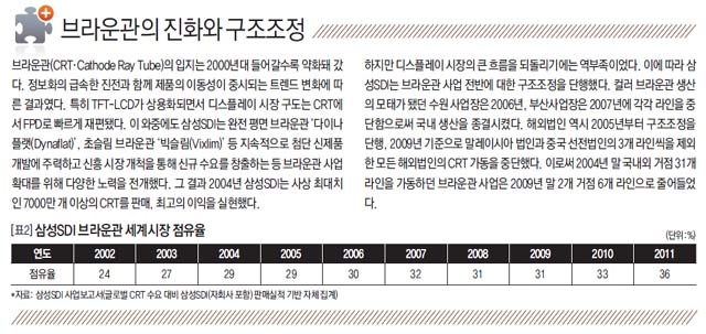 인터넷 검색창에 ‘2차전지’라는 단어를 입력하면 2차전지 주요 업체로 자동 연관 검색되는 회사가 있다. 삼성SDI다. 이 회사는 2012년 상반기 매출액(2조8540억 원) 중 57%(1조6315억 원)를 ‘에너지 및 기타’ 사업 부문에서 올렸다. 소형 리튬이온 2차전지 영역에선 글로벌 시장을 주도하고 있다. 일본 시장분석기관인 IIT의 최근 보고서에 따르면 2012년 1분기 기준 소형 리튬이온 2차전지 시장에서 삼성SDI가 세계 시장점유율 26.8%를 기록하며 1위를 차지했다. 삼성SDI의 최근 소식을 접하지 못한 사람은 ‘삼성SDI=에너지 기업’이란 분류가 낯설게 느껴질 것이다. 이 회사는 원래 TV 브라운관 전문 업체였기 때문이다. 1980년대∼1990년대엔 흑백·컬러TV 브라운관 시장을 주도했고 2000년대 중반엔 전 세계 PDP 시장을 호령했다. 브라운관 전문 업체로 출범해 PDP를 중심으로 한 차세대 디스플레이 업체로 탈바꿈했던 이 회사는 이제 친환경 에너지 기업으로 또 한번 변신 중이다. 단순히 모습만 바꿔가는 게 아니다. 변신에 변신을 거듭하면서도 각 분야에서 경쟁 우위를 확보하는 데 성공했다.