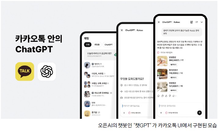 카카오톡 이용자들은 10월 중 채팅탭 상단의 ‘ChatGPT’ 버튼을 클릭해 챗봇 서비스를 즉시 이용할 수 있게 된다. 챗GPT와의 대화 내용과 생성 콘텐츠를 대화방에 직접 공유할 수 있고 카카오톡 대화 중 신속하게 챗GPT로 전환해 활용할 수 있다. 카카오톡에 적용되는 챗GPT는 오픈AI의 최신 모델인 GPT-5를 기반으로 한다.