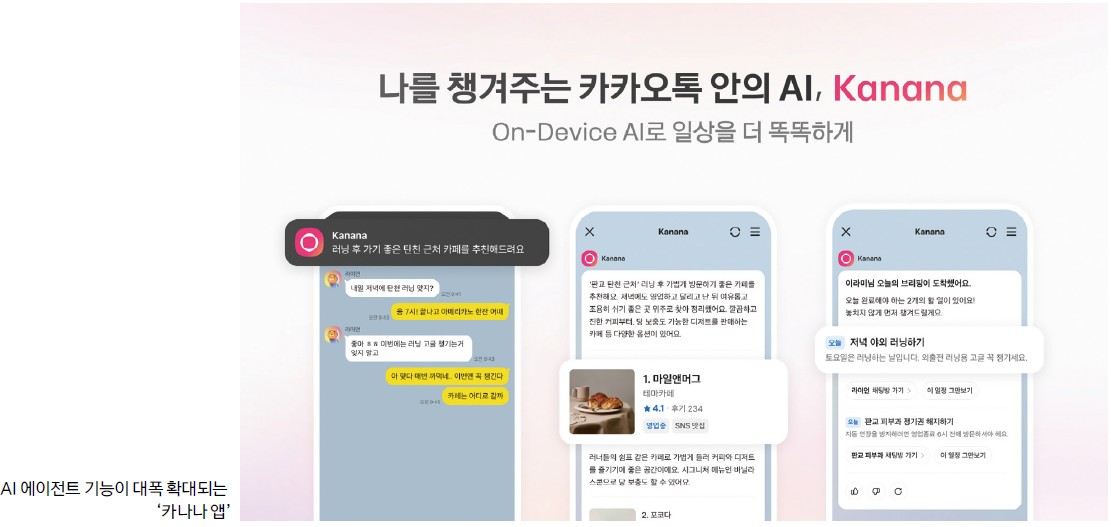 AI 전략으로는 오픈AI의 챗GPT-5와 자체 개발한 경량화 모델 ‘카나나 나노’를 동시 활용하는 투트랙 접근을 택했다. 챗GPT는 카카오 서비스들과 연계되며 카나나는 개인정보 보호를 위해 온디바이스 방식으로 구현된다. 증권가는 AI 에이전트와 서비스 생태계의 결합으로 커머스·광고·구독 매출 증가를 예상하면서 긍정적으로 평가했다. 반면 일부 사용자는 메신저 본연의 기능과 직관성이 훼손되고 프라이버시 노출 우려가 커진다며 불만을 표출했다. 이에 카카오는 일부 UI 개편안을 급히 철회하는 등 사용자 신뢰 회복에 나섰지만 혁신과 사용자 경험 사이의 접점을 찾는 것이 앞으로의 과제로 남았다.