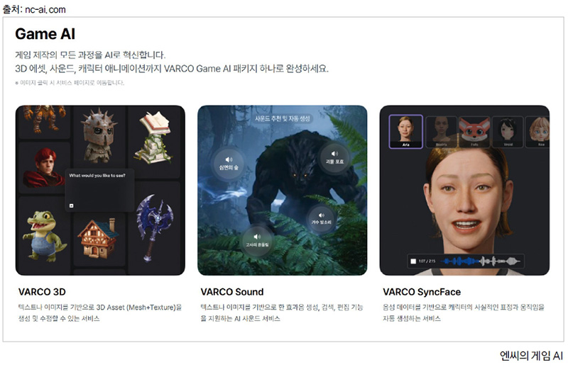 특히 NC AI는 엔씨의 MMORPG 개발 경험을 바탕으로 게임 제작의 모든 과정을 AI로 혁신하는 ‘게임 AI(Game AI)’ 기술력을 보유하고 있다. 대표적으로 AI 기반 대화 시스템을 갖춘 AI NPC(Non-Player Character, 비플레이어 캐릭터) 대화 시스템은 기존처럼 미리 짜인 대사를 반복하지 않는다. 대신 플레이어의 말에 맞춰 실시간으로 반응하고 상황에 어울리는 새로운 대사를 생성할 가능성을 열어 뒀다. 이러한 AI 기술은 게임의 설정이나 캐릭터 정보, 세계관을 바탕으로 스토리 요소를 만드는 데 보조 역할을 할 수 있다.