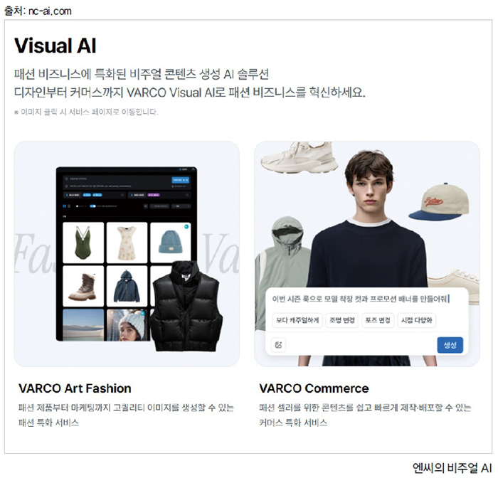 NC AI의 바르코 아트패션(VARCO Art Fashion) 역시 패션 디자이너와 마케터를 위한 AI 이미지 생성 도구로 패딩 점퍼, 다운 점퍼 등 업계 전문 용어와 트렌드를 학습한 ‘패션 전용 베이스 모델’을 기반으로 한다. AI를 통해 제품 디자인 시안부터 모델 착장 컷, SNS 마케팅용 비주얼까지 다양한 패션 콘텐츠를 손쉽게 제작할 수 있도록 지원하는 것이다. 실제로 디자이너가 스트리트 캐주얼처럼 자연어 프롬프트인 키워드만 입력하면 약 3.2초 만에 10종 이상의 의류 디자인 시안을 자동으로 생성한다. 또한 브랜드 맞춤형 가상 모델 피팅과 배경 합성까지 가능해 시제품 제작 없이도 미리 결과물을 확인할 수 있다. 실제 이 기술을 도입하는 브랜드도 늘고 있는데 MLB, 디스커버리 익스페디션으로 잘 알려진 패션 기업 F&F는 바르코 아트를 도입해 신상품 기획부터 디자인, 생산까지의 전체 주기를 무려 절반으로 단축하는 데 성공했다.