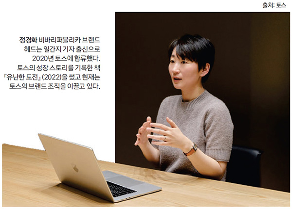 “토스팀은 오늘도 어김없이 실패하고 있다. 꿈을 이룬 듯 보일 때마저도 더 큰 꿈을 꾸고 있다. 현재 진행형인 토스팀의 여정을 돌아보려고 하니 사람들 이야기만 남았다. 인생의 어느 시기, 남다른 목표를 향해 있는 힘껏 경주하는 이들의 이야기다.” 정경화 비바리퍼블리카(이하 토스) 브랜드 헤드가 쓴 책 『유난한 도전』(2022)의 프롤로그다. 그는 이승건, 이태양 창업자를 비롯해 토스의 전현직 구성원 35명을 인터뷰하며 실패를 포함한 토스의 성장 여정을 소개했다. 영어가 서툴러 해외 투자 유치에 실패해 눈물 흘렸던 순간, 연속적으로 발생한 서비스 장애에 대응하며 고통스러웠던 순간부터 처음으로 월 손익분기점을 달성한 순간까지.