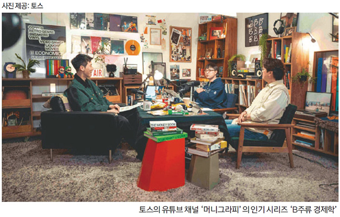 모든 브랜드 콘텐츠가 성공하는 것은 아니다. 성공과 실패를 가르는 요인은 무엇이라고 생각하는가.브랜드만의 진짜 스토리, 즉 오리지널리티(Originality)다. 토스가 말하고자 하는 메시지는 언제나 일관적이고 명확했다. 사용자의 시선에서 질문을 던지고 기술을 통해 답을 찾아 세상의 기준으로 만든다는 것이다. ‘1원 인증’이 대표적이다. 토스가 사용자의 다른 은행 계좌로 1원을 보내면 입금 메시지에 표시된 고유 문구로 인증하는 식이다. 토스가 제안한 편리한 인증 방법이 지금은 산업의 표준이 됐다. 현재는 금융뿐만 아니라 일상의 모든 불편도 토스가 해소해 나가야 할 대상이 됐다. 토스의 모든 스토리와 콘텐츠는 여기서 시작한다.토스의 유튜브 채널 ‘머니그라피’의 대표 시리즈 ‘B주류경제학’은 ‘소비문화 디깅(Digging) 토크쇼’를 콘셉트로 소비 트렌드를 경제적 관점에서 깊이 있게 분석한다. 김창선 PD, 이재용 회계사와 유튜버 육식맨과 장석종, 스탠드업 코미디언 원소윤, 문학편집자 김민경, 드러머 김간지 등 세대와 직업을 넘나드는 출연진이 각자의 시선으로 취향의 경제에 관해 이야기를 나눈다. 각 출연자가 자신의 소비 경험을 나누는 데서 나아가 각 산업 대표 기업의 재무제표를 뜯어보거나 잔뼈 굵은 업계 사람들만의 식견을 공유하는 등 소비문화를 입체적으로 풀어내며 구독자 수 55만여 명, 누적 조회수 5200만 회를 달성했다.