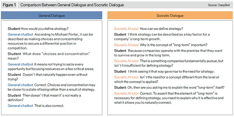 Because it begins with a question and is designed to continue with clarifying and follow-up questions, it relies much less on the quality of input from the user. Even if students do not understand the question clearly and lack clarity in their responses, it continues learning progressively through additional questions based on responses provided, allowing students to learn through the discussion. [Figure 1] demonstrates the difference between general dialogue and Socratic AI dialogue. With general GenAI services, answers will likely be vague without clear and specific questions from the users. With Socratic AI, by asking questions first and requesting additional clarifications about parts not clearly explained, students can more easily identify what they can’t explain and what to ask. This dialogue process, seen from the instructors’ perspective, also allows the AI agent (and thus the instructor) to identify what students understand and what they don’t about the content being discussed.