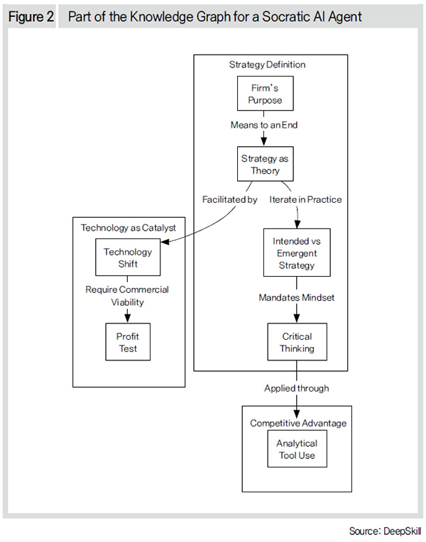 For example, [Figure 2] shows how the logical structure for defining strategy is built into a knowledge graph. The uppermost box progresses from viewing strategy as based on firm’s purpose → means to achieve it → strategy as a testable “theory” for achieving the end goal → intended strategy turning into emergent strategy through iterations in practice → critical thinking as a necessary component. Such schematized knowledge graph becomes the foundation for the AI agent to understand the relationships between concepts and the logical structure for discussion.