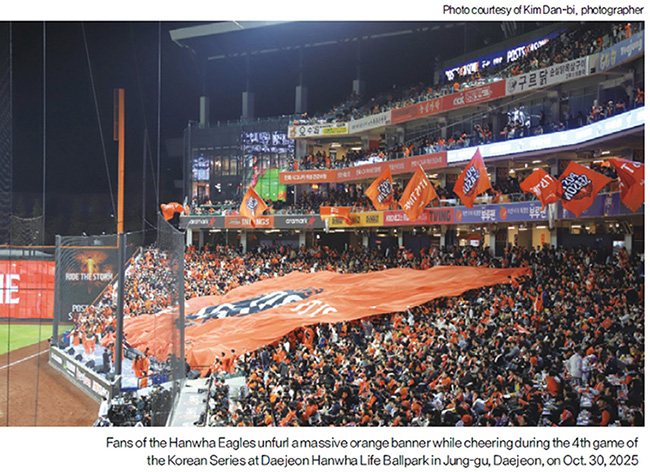 On Oct. 30, 2025, at Daejeon Hanwha Life Ballpark in Jung-gu, Daejeon, where the 4th game of the Korean Series was held, the chant “Mighty Hanwha!” shook the stadium as the Hanwha Eagles began their offense in the bottom of the eighth inning. In the first-base cheering section, orange flags rippled like waves, and Hanwha Eagles fans raised towels to amplify the fervor of their support. As the atmosphere surrounding the home team reached its peak, the mood suddenly shifted. In the top of the ninth inning, the LG Twins completed a comeback. Roars poured out from the third-base cheering section, where fans wearing glossy jackets emblazoned with large LG Twins logos energetically sang along to the team’s fight song.
