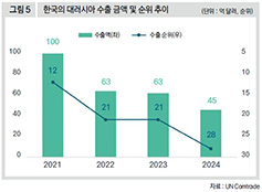2021년 기준 우리나라의 대러시아 수출은 자동차, 자동차부품, 레일 및 철 구조물 등 운송기기 관련 품목이 가장 큰 비중을 차지했다. 그러나 2024년 기준으로 이들 품목의 수출이 급격히 감소하며 러시아 시장에서의 입지가 크게 축소됐다.