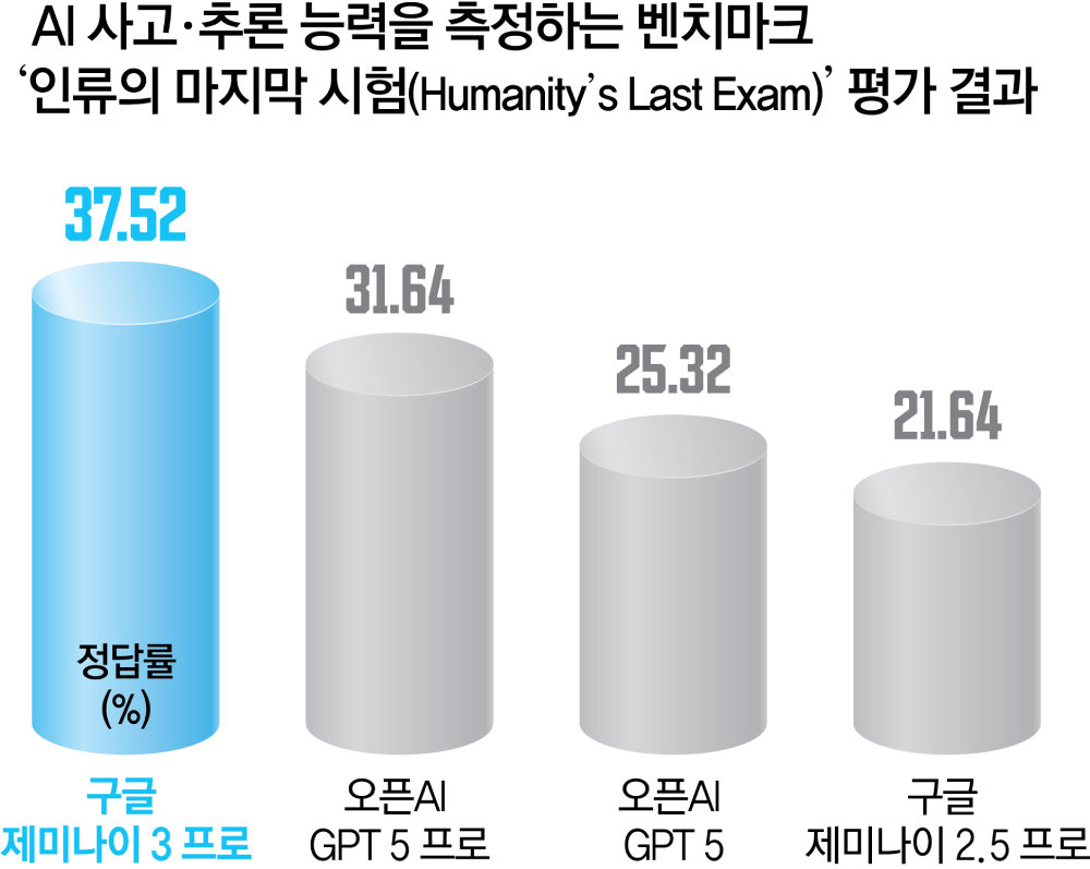제미나이 3 프로는 AI 모델 평가 사이트 LM아레나(Arena) 리더보드에서 1501점을 기록해 기존 1위였던 제미나이 2.5 프로를 제쳤다. AI의 능력을 비교하는 주요 벤치마크인 ‘인류의 마지막 시험(Humanity’s Last Exam)’에서도 제미나이 3 프로는 정답률 37.5%를 기록하며 오픈AI의 GPT 5 프로(31.6%)를 앞섰다.