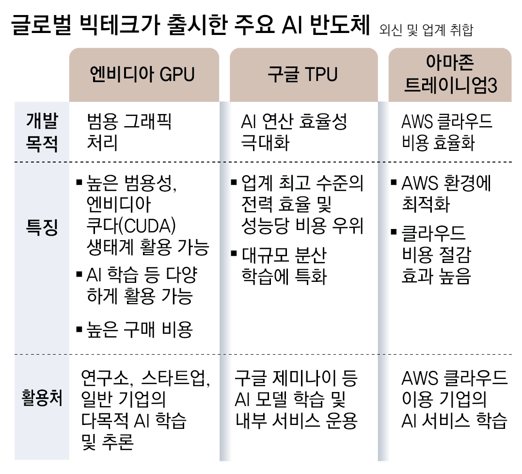 기업별로 서비스 특성이 다른 점도 자체 AI 칩 개발의 이유가 됐다. 가령 AWS는 클라우드, 구글은 제미나이 같은 대규모언어모델(LLM) 학습을 위한 AI 칩이 필요한 상황이라 여기에 맞는 AI 칩을 개발한 것이다. 범용으로 사용되는 GPU는 대부분의 연산을 처리할 수 있지만, 특정 기업의 모델 구조에 맞춰 설계된 전용 칩은 같은 양의 연산을 더 낮은 전력으로 처리할 수 있다.