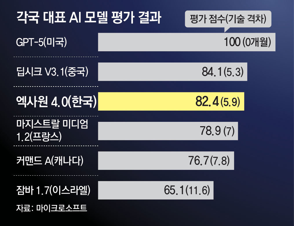 실제로 지난달 미국 마이크로소프트(MS)가 발간한 ‘AI 확산 보고서’가 각국 대표 AI 모델을 비교해 한국 LG 엑사원 4.0 모델을 미국 오픈AI의 GPT-5, 중국 딥시크 3.1버전에 이어 3위로 평가하는 등 가시적 성과도 나타나고 있다. GPT-5의 성능을 100으로 봤을 때 딥시크 3.1은 84.1, 엑사원 4.0은 82.4라는 점수를 받았다. 또한 보고서는 미국을 기준으로 볼 때 중국의 기술 격차는 5.3개월, 한국은 5.9개월로 평가했다.