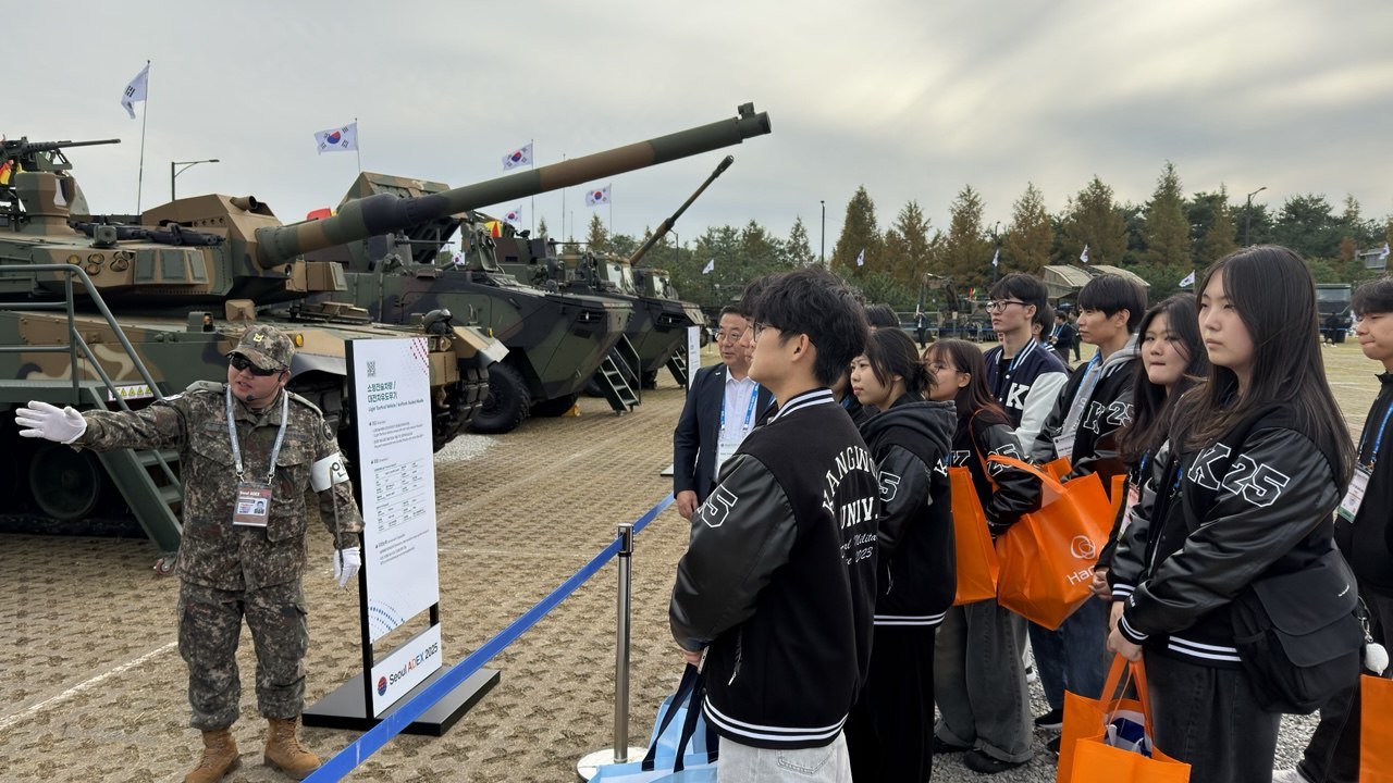 강원대 학생들이 ‘2025 서울 국제항공우주 및 방위산업 전시회’에서 최첨단 방산 기술을 체험하고 있다. 강원대 제공