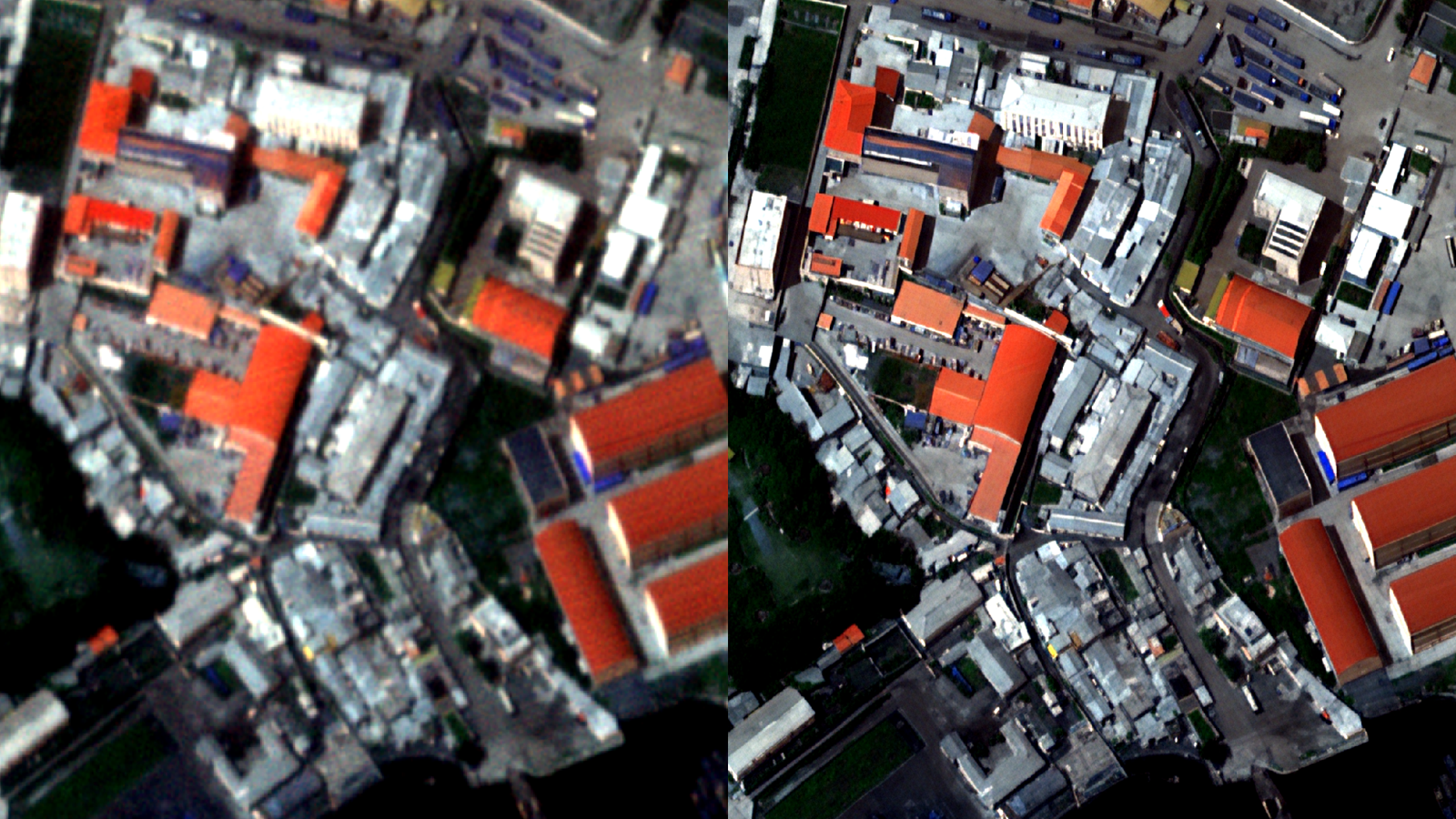 한화시스템에서 개발하고 있는 위성영상 분석 인공지능(AI) 시스템이 흐릿한 영상(왼쪽 사진)을 선명하게 바꾸는 해상도 업스케일링을 진행한 모습(오른쪽 사진). 한화시스템 제공