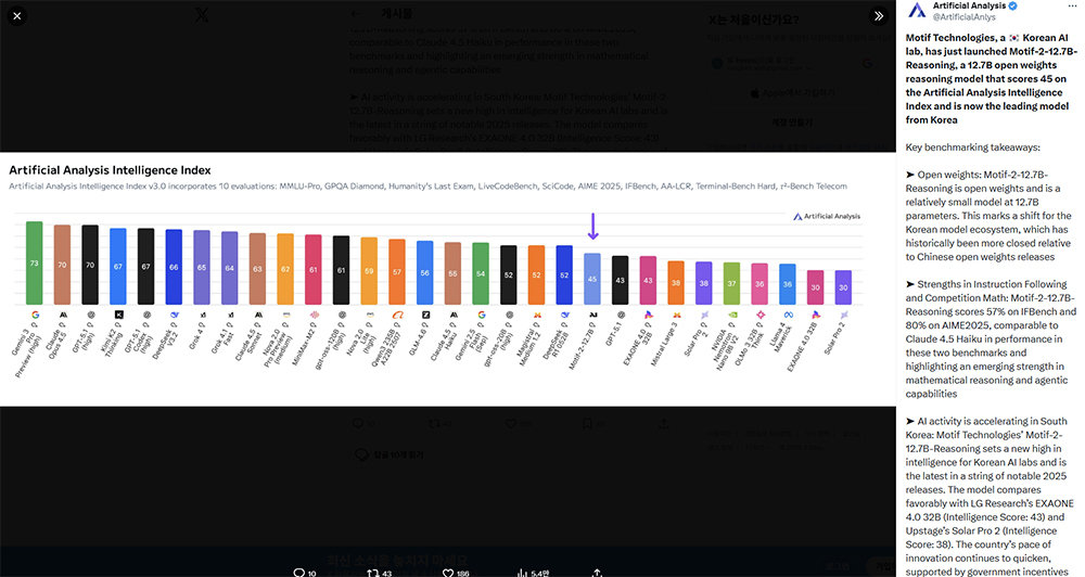 글로벌 AI 성능 비교의 핵심 벤치마크로 손꼽히는 아티피셜 애널리시스에서 직접 모티프-2-12.7B 모델을 거론하며 그 성능을 높게 평가한 바 있다 / 출처=아티피셜 애널리시스