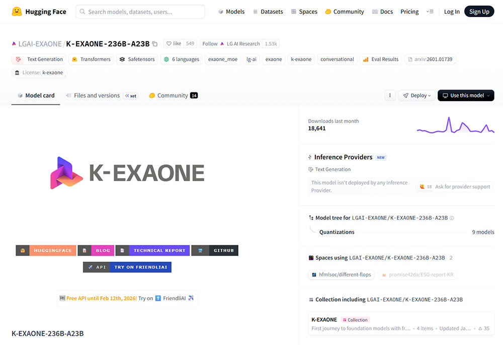 LG AI 연구원이 개발한 K-엑사원이 오픈소스 커뮤니티 ‘허깅페이스’에 업로드된 모습 / 출처=허깅페이스