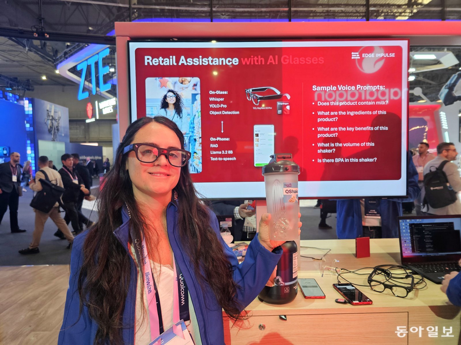 큐웬 AI 글라스에는 퀄컴의 스냅드래곤 웨어러블 전용 칩셋이 장착돼 최적의 답을 생성해 보여 준다. 바르셀로나=김재형 기자 monami@donga.com
