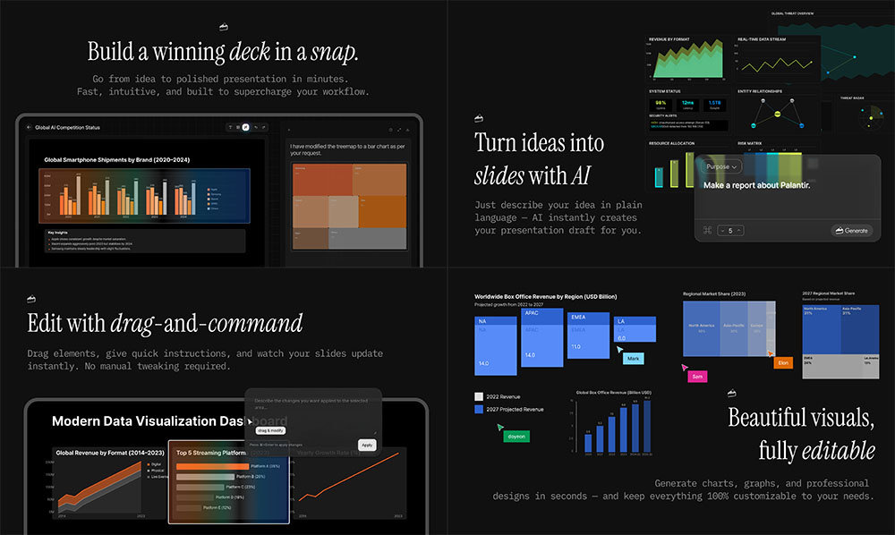또한 스냅덱은 채팅 인터페이스를 통한 실시간 수정이 가능합니다. 사용자는 수정 사항을 “기둥형 그래프를 선형 그래프로 바꿔” “선택한 모든 텍스트를 흰색으로 변경해” 등 자연어로 요청하면 됩니다. 슬라이드 편집 과정을 획기적으로 단순화한 것이죠. 복잡한 편집 도구를 익힐 필요도 없습니다. 물론 기존 방식대로 클릭이나 드래그로 수정하는 것도 가능합니다.