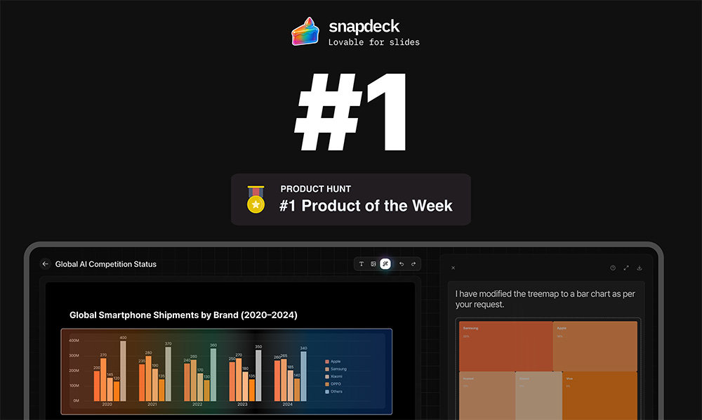 론칭 당일에는 오늘의 제품 2위에 올랐고, 일주일 후에는 이주의 제품 1위에 선정됐어요. 이는 글로벌 사용자들이 실제 제품을 체험하고 남긴 긍정적인 피드백과 평가로 인한 결과입니다. 현재 스냅덱은 사용자로부터 ‘정말 빠르다’ ‘결과물 품질이 놀랍다’ ‘자연어로 수정할 수 있어 편하다’ 등의 평가를 받고 있습니다.
