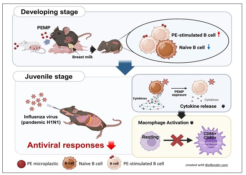 연구팀은 일상생활에서 컵, 포장지, 비닐봉지 등을 만드는 데 사용되는 플라스틱인 PE를 이용해 동물실험을 진행했다. 모체 쥐에게 PE 미세플라스틱을 먹이자 미세플라스틱은 모유를 통해 새끼의 체내로 이동했다. 연구 결과 새끼의 비장에 미세플라스틱이 다량 축적된다는 사실이 발견됐다. 비장은 몸속 면역세포를 조절하는 기관으로, 비장 기능에 이상이 생기면 감염병에 쉽게 걸린다.