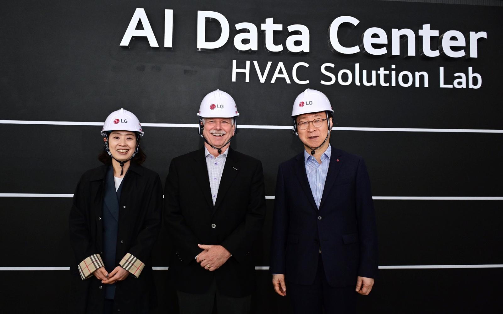 LG전자가 AI 데이터센터 냉각솔루션 포트폴리오를 액침냉각 방식까지 확장하기 위해 SK엔무브, 美 액침냉각 전문기업 GRC와 ‘AI 데이터센터 냉각솔루션 사업 확대를 위한 업무협약’을 체결했다고 28일 밝혔다.  SK엔무브 남재인 Green성장본부장(왼쪽부터), GRC 피터 폴린(Peter Poulin) CEO, LG전자 이재성 ES사업본부장이 LG전자 칠러사업장 내 구축된 AI 데이터센터 전용 테스트베드에서 기념 촬영을 하고 있다. 2025.10.28. LG전자 제공