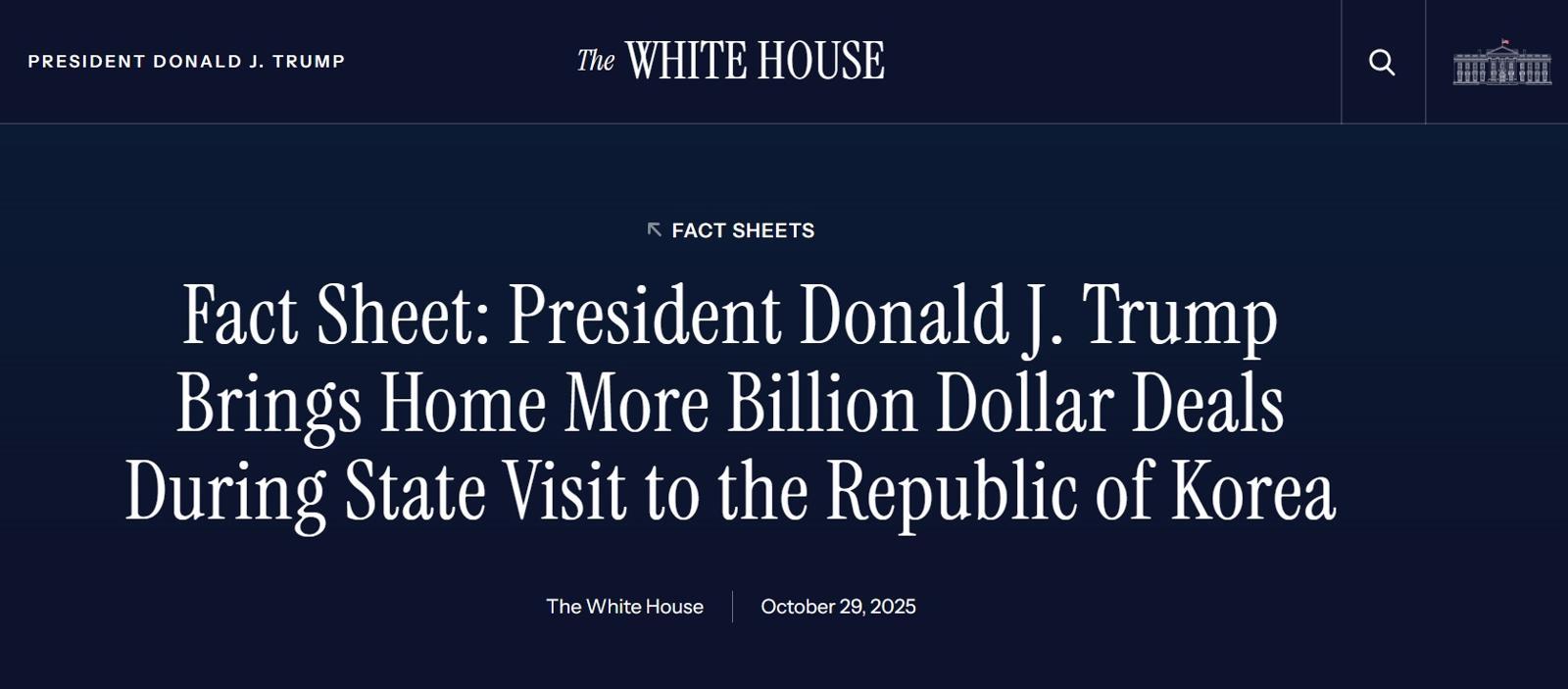 백악관은 “트럼프 대통령의 한국 국빈 방문은 한미의 확고한 동맹을 재확인하는 동시에 미국의 경제적 이익을 증진시켜 미국 국민에게 실질적인 혜택을 가져다줬다”며 “이번 발표는 트럼프 대통령이 일본과 말레이시아 등에 머무는 동안 확보한 역사적인 무역 승리와 인프라 공약을 바탕으로 수십억 달러의 투자와 수천 개의 일자리를 미국에 가져온 결과”라고 강조했다.