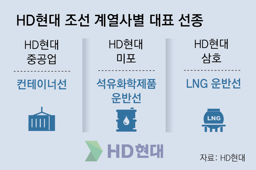 최근 HD현대의 대표 제품군은 수익성이 높은 선종이다. HD현대미포의 주력 제품인 액화천연가스(LNG) 운반선은 영하 163도 극저온에서 액화가스를 운송하는 용도의 선박으로 고도의 기술력이 필요하다. 한국 조선사들이 글로벌 시장에서 70%대 점유율을 차지하는 ‘수출 효자’ 선종이기도 하다. 1만 TEU(1TEU는 20피트짜리 컨테이너 1개)급 이상 규모의 초대형 컨테이너선은 HD현대중공업의 주력 제품이다. 전 세계 물동량의 대부분을 운반한다는 점에서 수요가 높다.