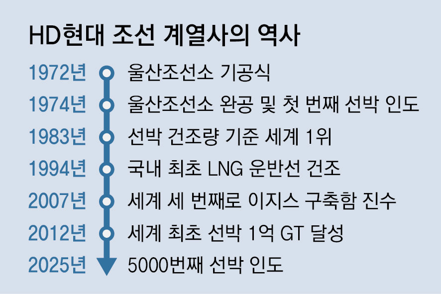 HD현대가 중대형 선박을 만드는 조선사 중 최초로 5000번째 선박을 고객에게 인도했다. 1974년 첫 선박을 인도한 뒤 51년 만이다. 일본, 유럽 등에 밀린 후발주자에서 시작해 세계 1위로 올라선 한국 조선업의 발전을 상징하는 일이란 평가가 나온다.