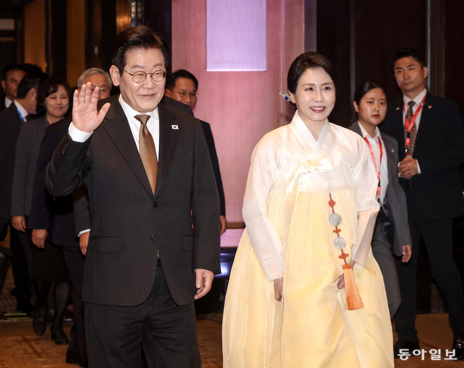 이재명 대통령과 김혜경 여사가 20일(현지시간) 이집트 카이로의 한 호텔에서 열린 이집트 동포 지상사 간담회에 입장하고 있다. 카이로=송은석 기자 silverstone@donga.com