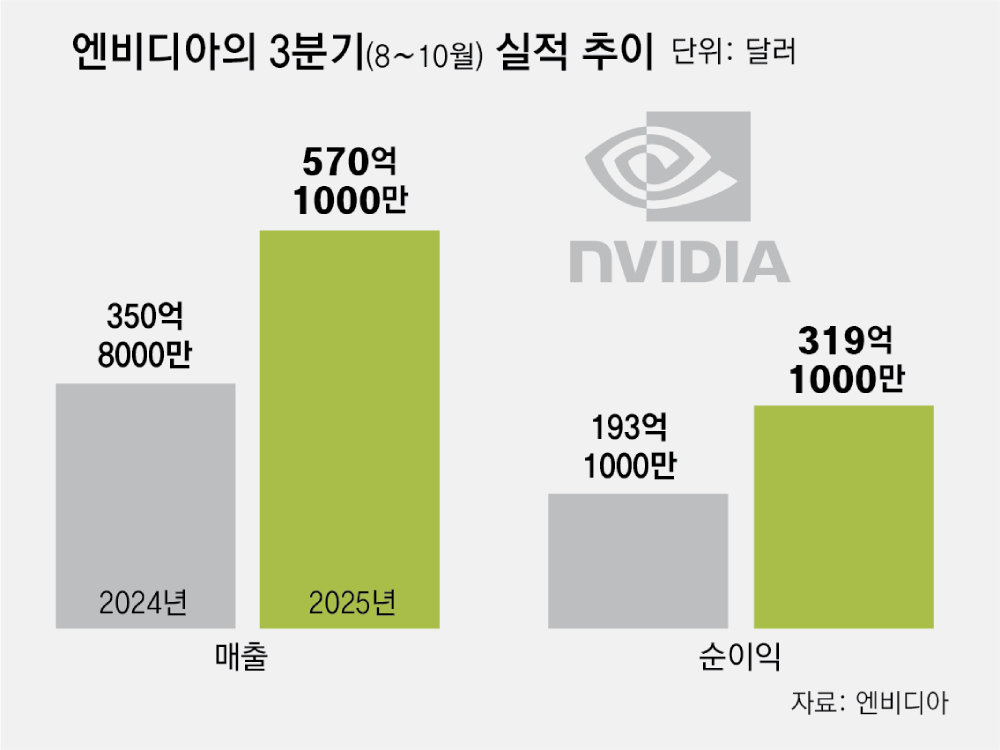 19일(현지 시간) 발표된 엔비디아의 올해 3분기(8∼10월) 실적은 AI 거품론은 물론이고 일각의 반도체 수요 하락 우려까지 잠재운 것이란 평가가 나온다. 엔비디아는 이날 1년 만에 62% 상승한 570억1000만 달러의 매출을 공개하면서 향후 메모리 반도체 수요가 확대될 것임을 예고했다. 엔비디아의 호실적은 전 세계적으로 AI 관련 투자가 확대되면서 최신 그래픽처리장치(GPU)인 ‘블랙웰’의 수요가 이어지고 있기 때문이다.