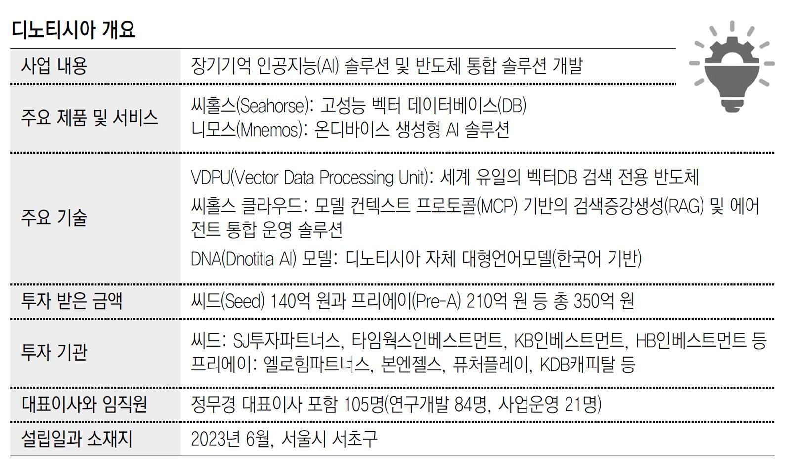 지난달 28일 서울 서초구 사무실에서 만난 정무경 디노티시아 대표이사(49)는 “실리콘밸리의 많은 벡터DB 회사들이 소프트웨어 위주로 자료를 처리하는 데 우리가 유일하게 전용 칩을 만들었다”며 “속도는 10배 더 빨라지고 데이터센터 비용은 80%나 절감할 수 있다”고 했다.