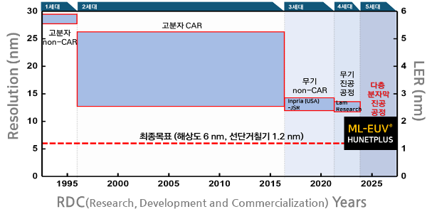 The ML-EUV® technology has achieved ultra-high resolution below 10nm and line edge roughness (LER) below 2nm, which were difficult to implement in existing chemical amplification (2nd generation), inorganic nanocluster (3rd generation), and inorganic dry (4th generation) processes. It is an innovative method that forms ultra-multilayer thin films of 10-20nm using a dry molecular layer deposition process with organic-inorganic monomers.
