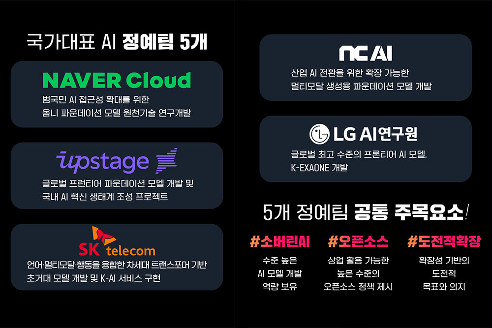 Naver Cloud, Upstage, SK Telecom, NC AI, and LG AI Research Institute have been finally selected. Each company will continue to compete until the final selection of two teams over the next three years / Source=Ministry of Science and ICT