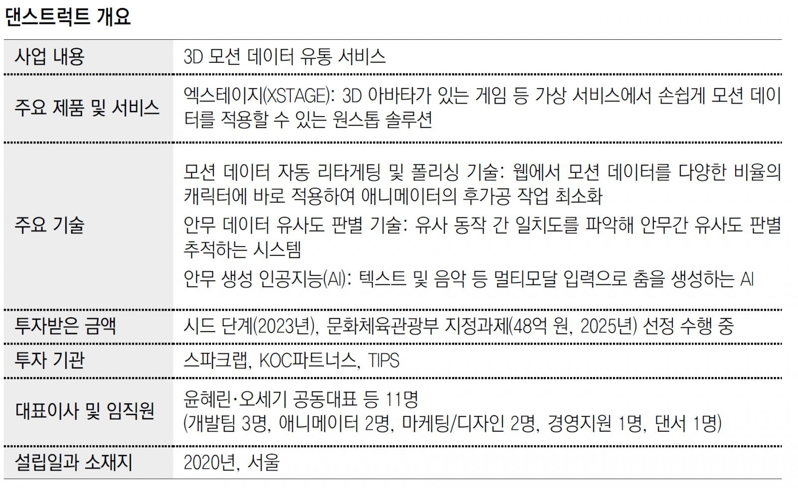 In 2023, she secured seed investments from SparkLabs, KOC Partners, and others, diving into the technology business in earnest. Co-CEO Oh Se-gi (38), an expert in information technology (IT) and business strategy, is also a KAIST MBA graduate. Currently, Danstruct is dedicated to the digitalization of choreography with a team of 11, including three developers, two animators, two in marketing and design, one in management support, and one dancer.