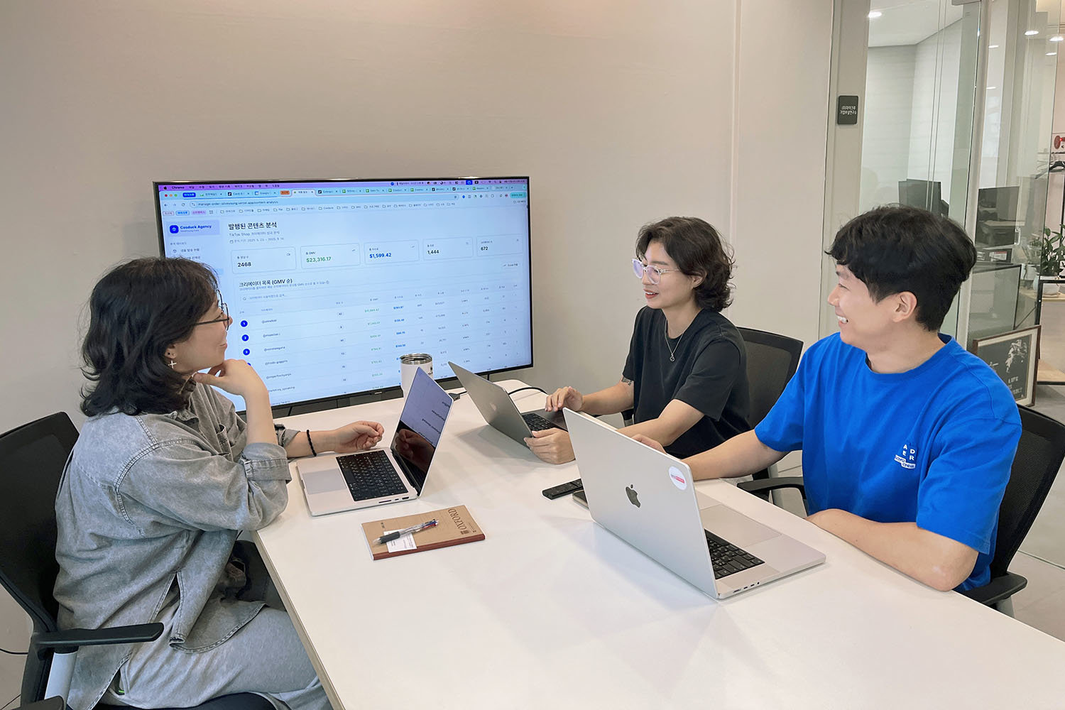 Junho Oh, CEO of Mayakrew (right), is having a conversation with Team Leader Sooyoung Park (left) and Team Leader Hyun Lim (center) / Source=Mayakrew