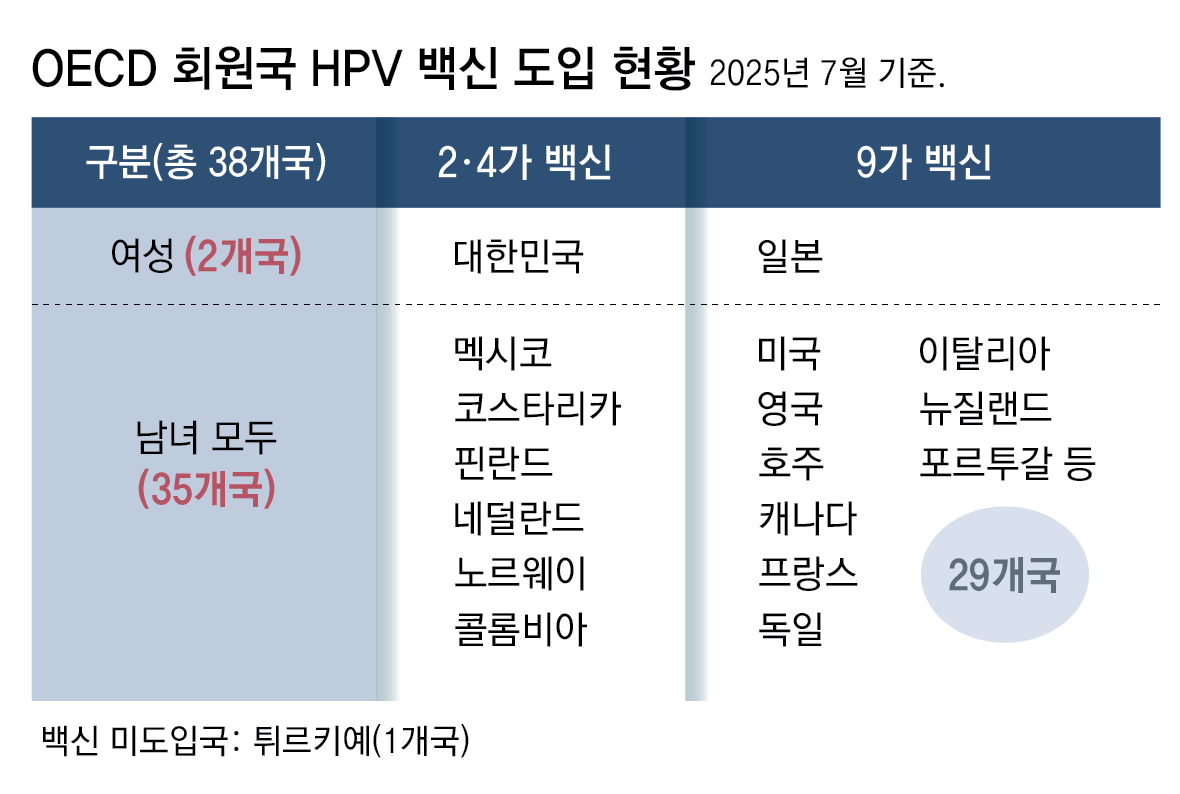 Meanwhile, 29 member countries of the Organization for Economic Cooperation and Development (OECD), including the United States, the United Kingdom, Australia, and Canada, have adopted the 9-valent vaccine as a national free vaccination for both males and females. The 9-valent vaccine, with its broad preventive range, has become the international standard for HPV prevention. However, in Korea, support is still limited to the quadrivalent vaccine for girls.