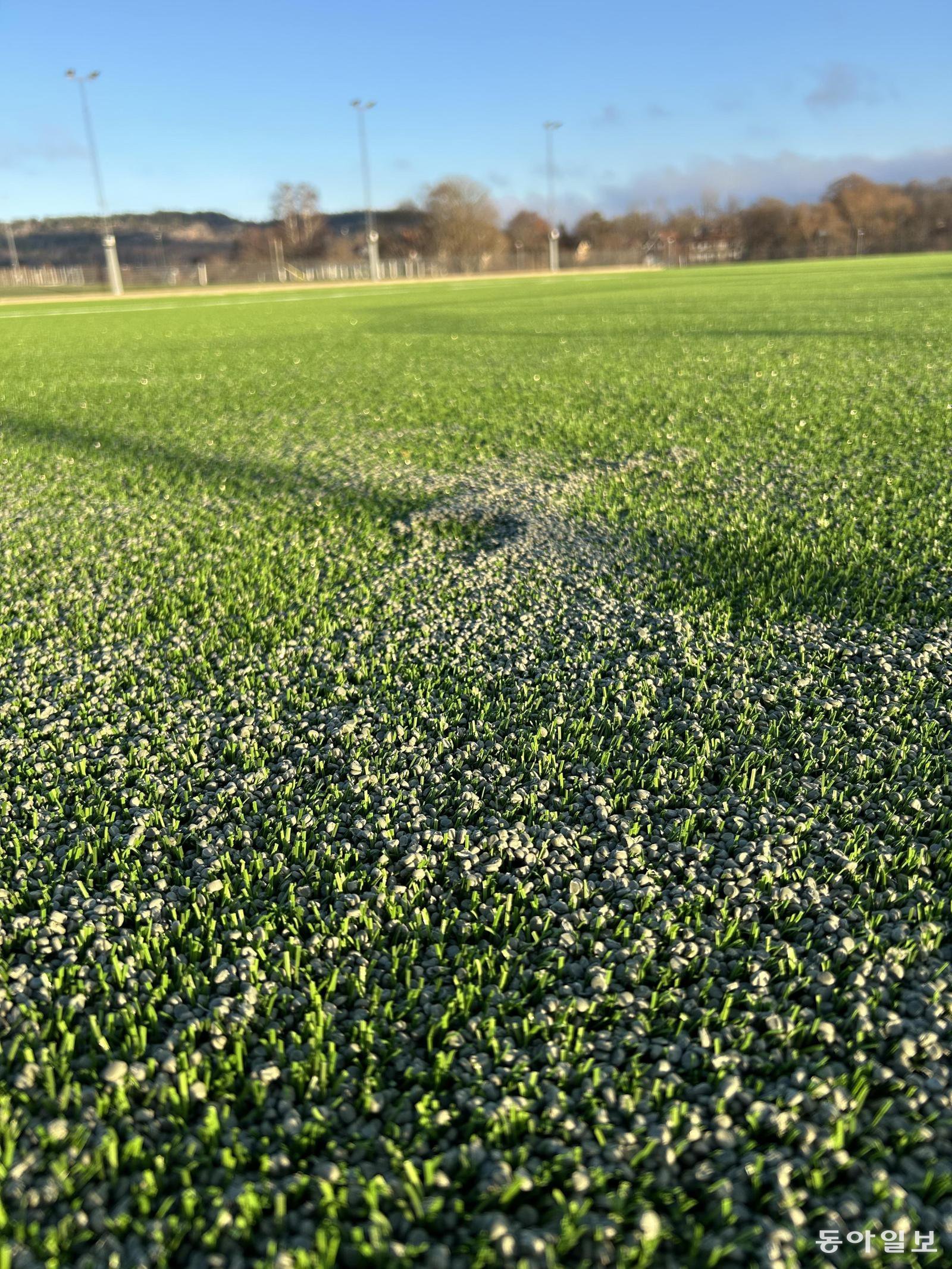 Correspondent Yoo Geun-hyung of this newspaper is experiencing the performance of eco-friendly artificial turf infill laid at a soccer stadium in Sweden on the 25th (local time). It seemed to absorb impact better and posed less risk of injury during tackles compared to artificial turf with rubber infill.