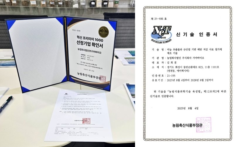 Kayabio selected as an Innovative Premier 1000 Company and received new technology (NET) certification from the Ministry of Agriculture, Food and Rural Affairs / Source=Kayabio