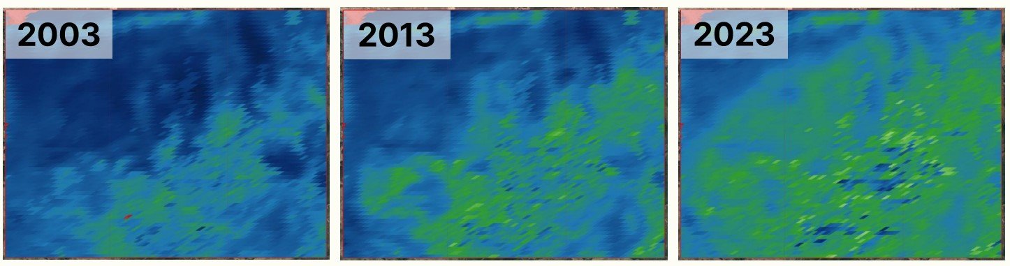 Visualization of the forest restoration process in the Tujin Nars region of Mongolia using AI-based satellite data / Source=MetaEarth Lab
