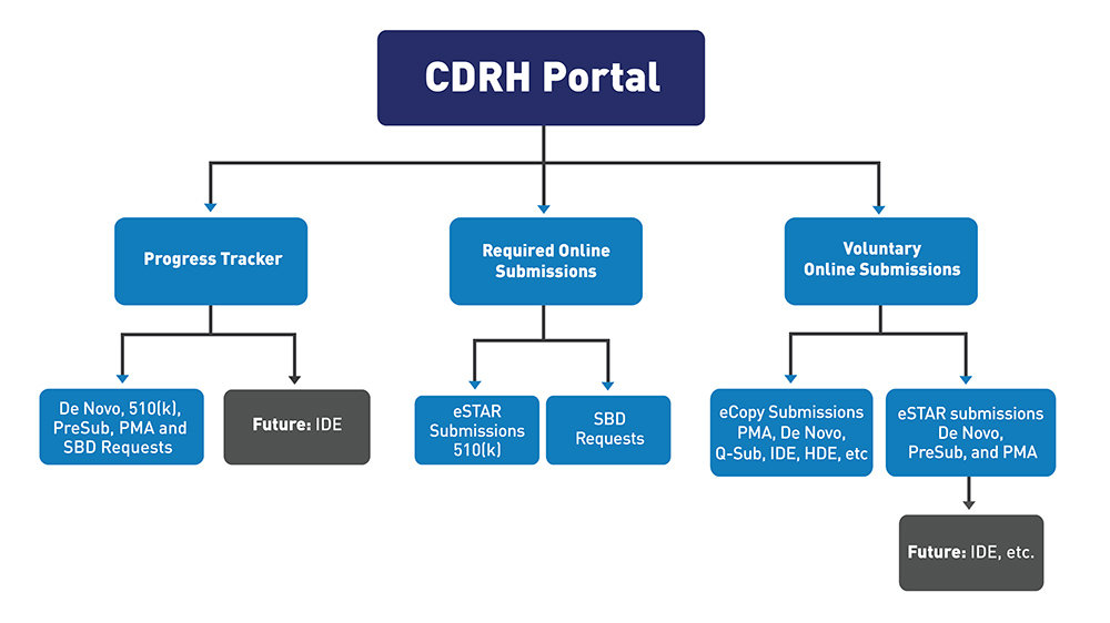 Structure of the FDA's medical device review document submission and management portal. PMA and De Novo have recently changed to mandatory eSTAR submissions, and the scope of PDF-based electronic submissions has expanded / Source=FDA